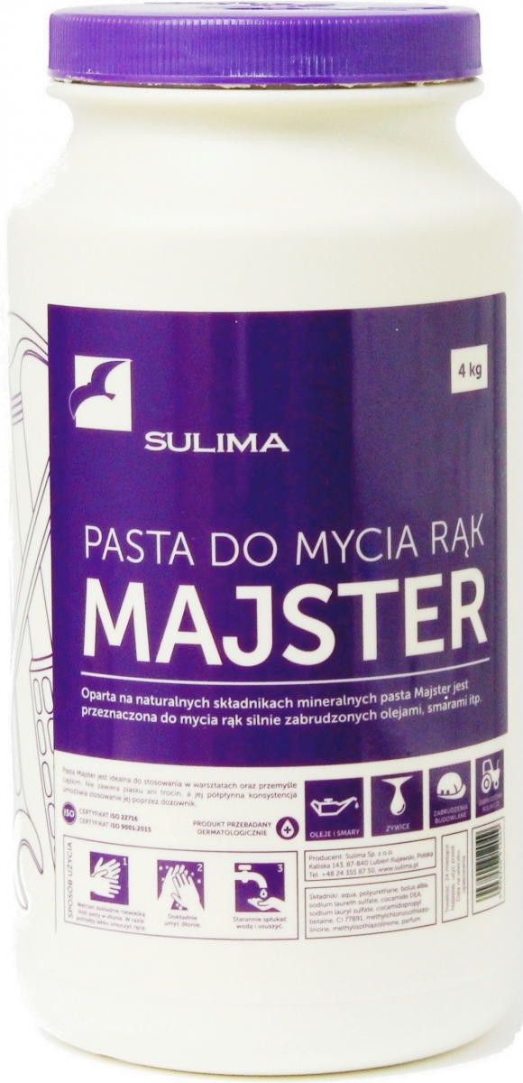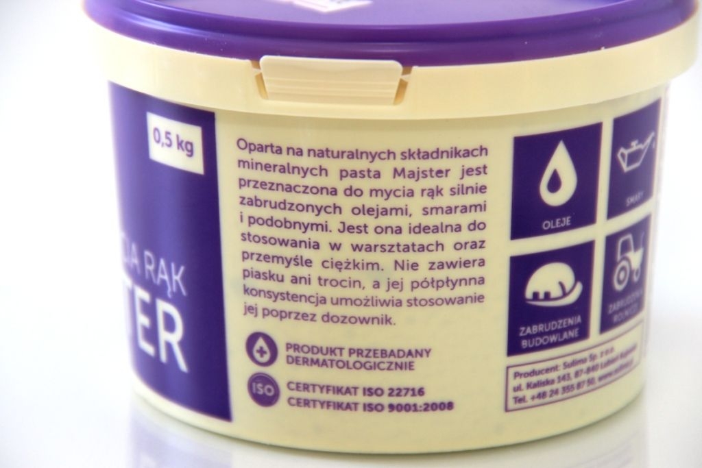 Pasta do mycia rąk Majster jest przeznaczona dla pracowników warsztatów i zakładów przemysłowych, która charakteryzuje się wysoką wydajnością – dwukrotnie wyższą niż pasty wiórowe – oraz przyjemnym mydlanym zapachem.